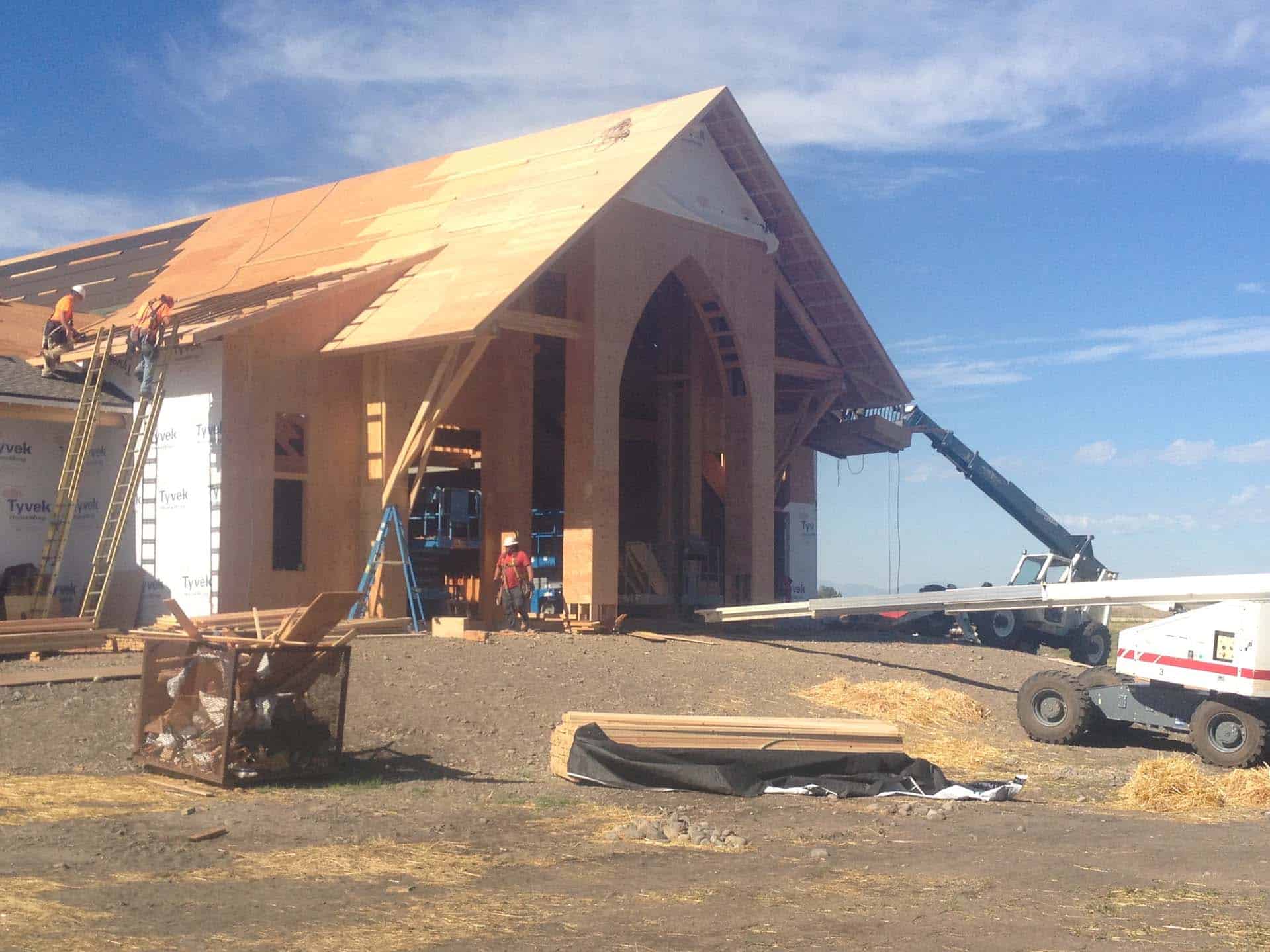 Multiple tall-wall gables, gothic arches and exposed timberwork highlight this complicated framing job. The 7,000# timber trusses were re-assembled on site (supplied by Western Wood Structures) and installed in the fellowship hall providing a beautiful frame for the Bridger Mountains.